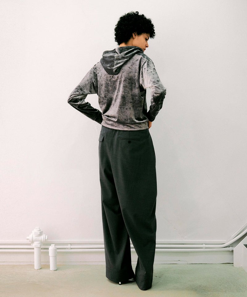 クラッシュ加工を施したベロア素材はムラ感のある表情がポイントで、動くたびに表情を変える艶感がよりシーズンムードを高めてくれる1枚。