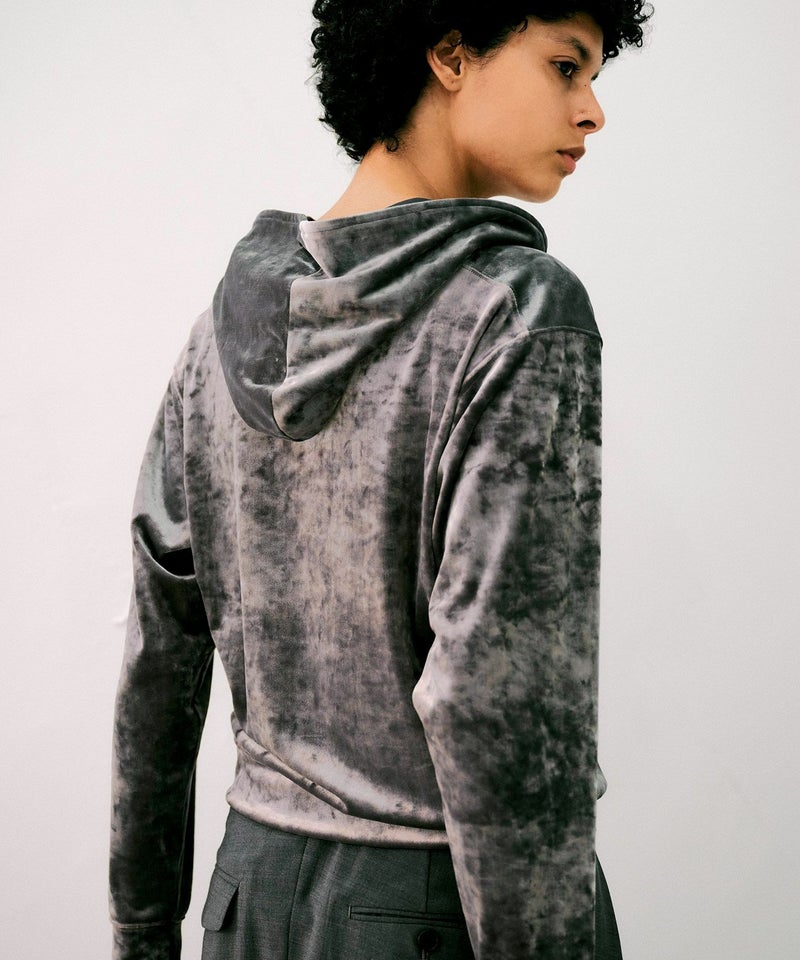 なめらかな優しい肌触りのベロア素材で、ストレスフリーな着心地のジップパーカー。