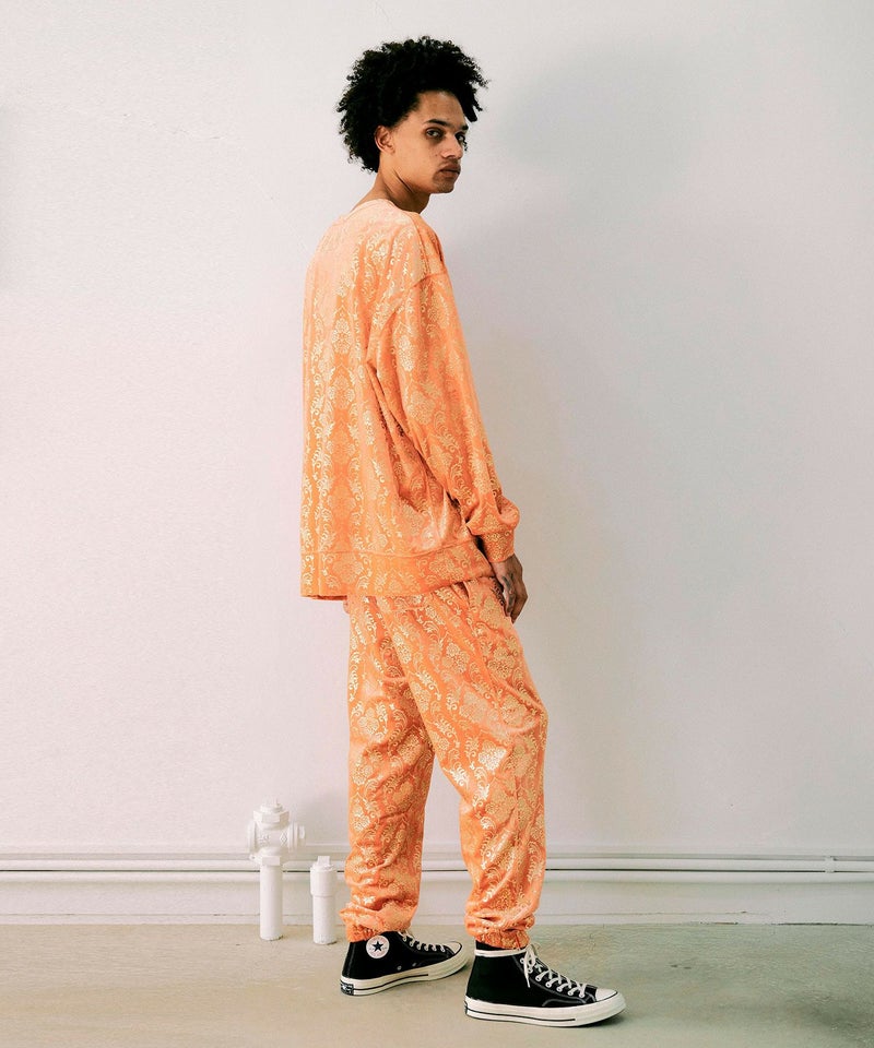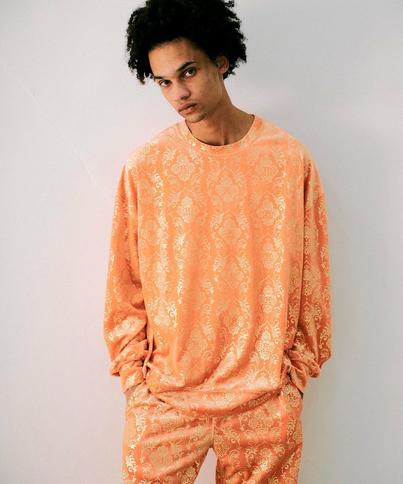 インパクトのあるダマスクパターンをゴールドでプリントした、ベロア素材のロングスリーブプルオーバー。