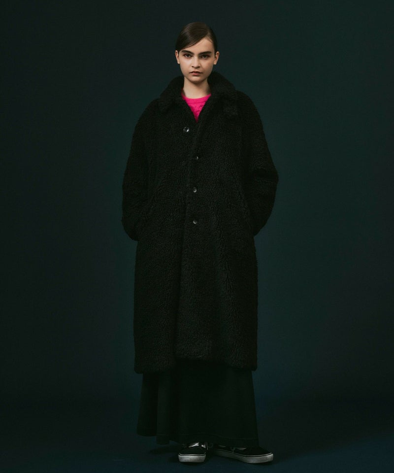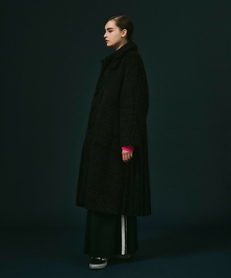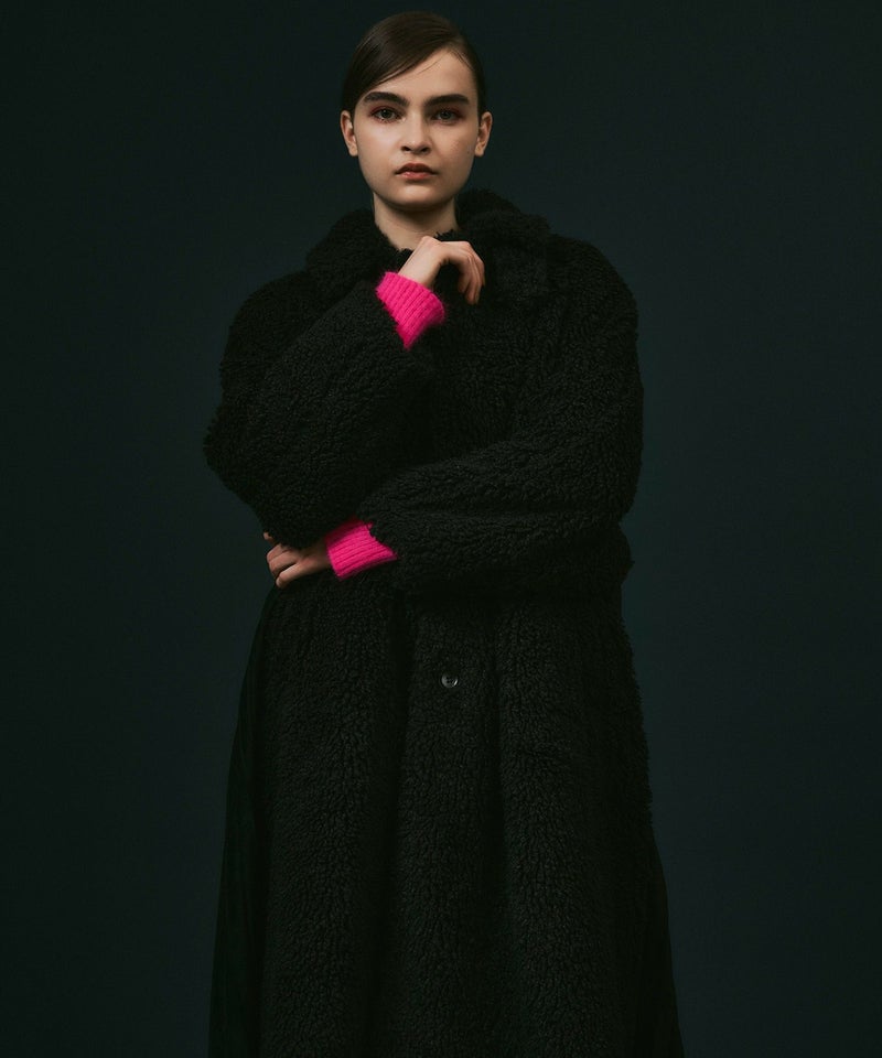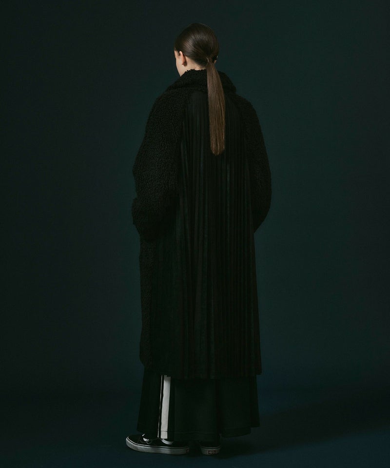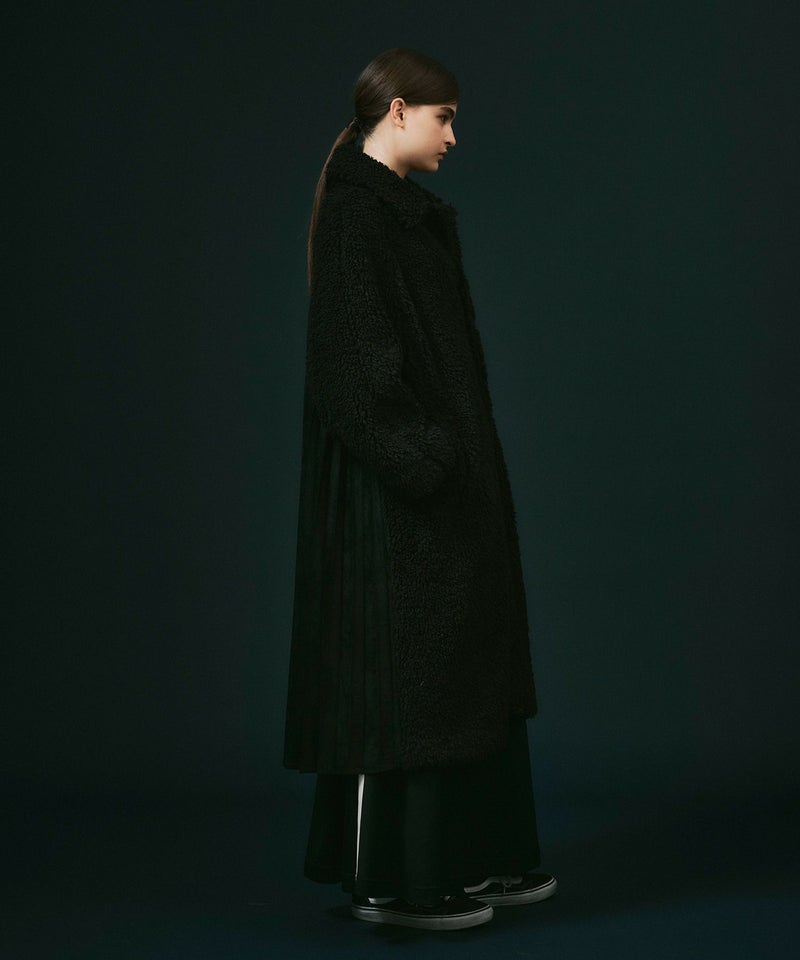 フロントは華やかでカールした毛足がやや長めの動きのあるボアを、バックはフェイクスウェードを贅沢にたっぷりと使ってアコーディオンプリーツを施し、羽織るだけで映える主役級アウター。