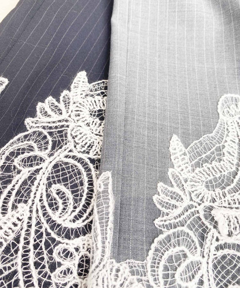 端正なピンストライプに、繊細なレースを掛け合わせたワイドパンツ。