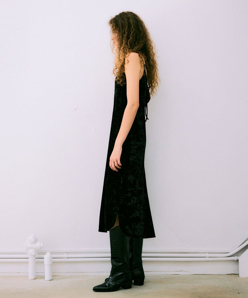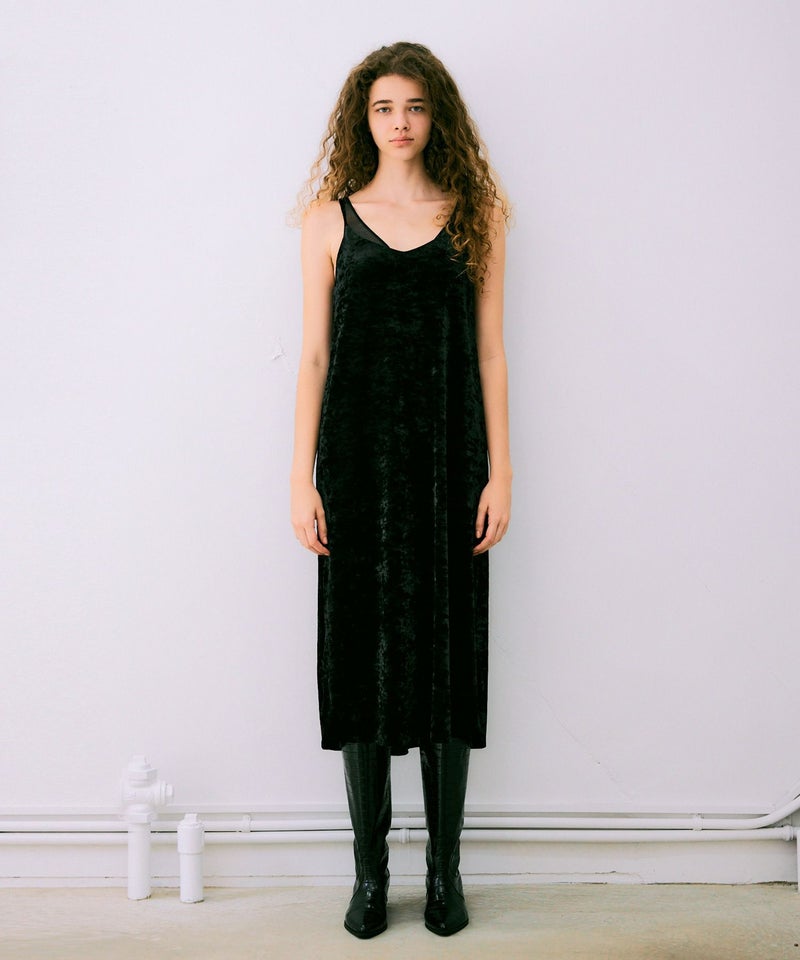 柔らかく微光沢のベロア素材で落ち感があるので、身体のラインを拾わずにすっきりと見せてくれるキャミワンピース。