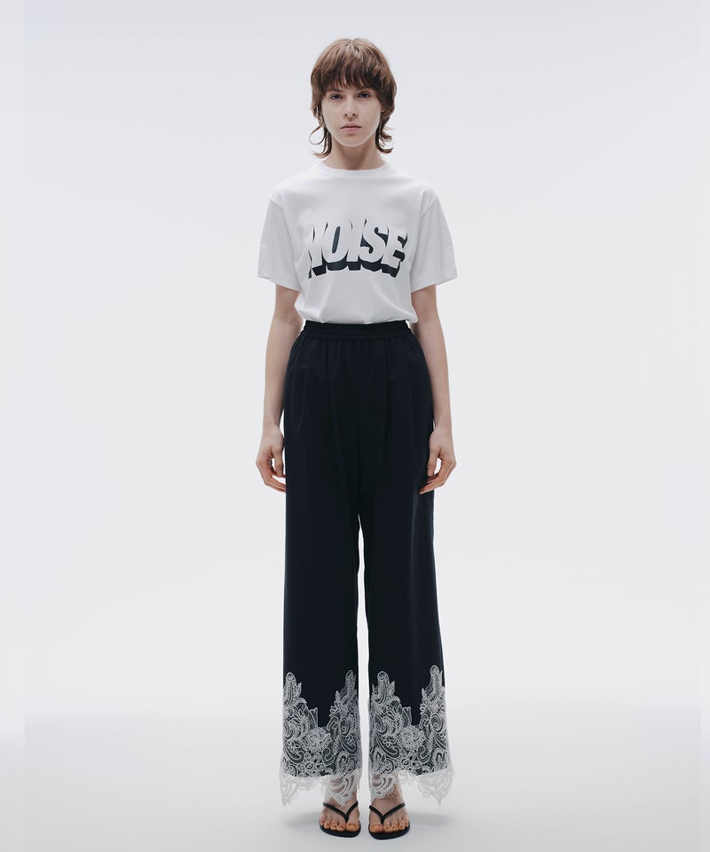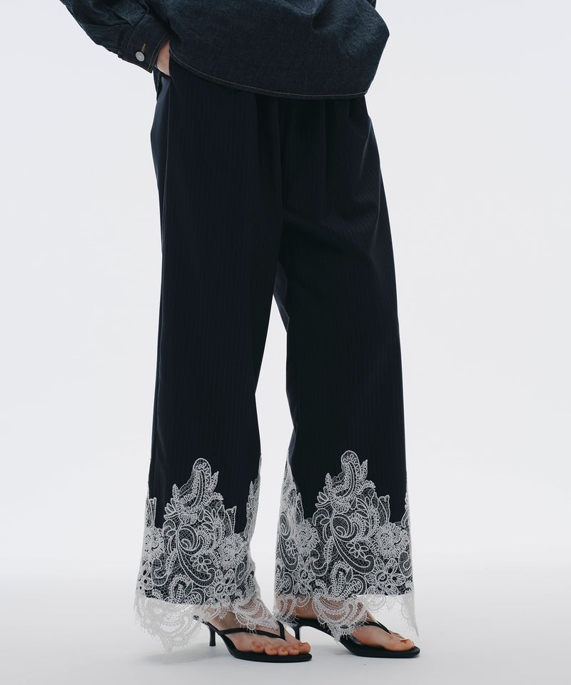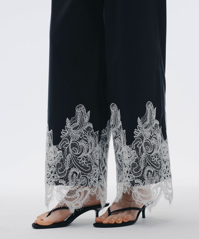 端正なピンストライプに、繊細なレースを掛け合わせたワイドパンツ。