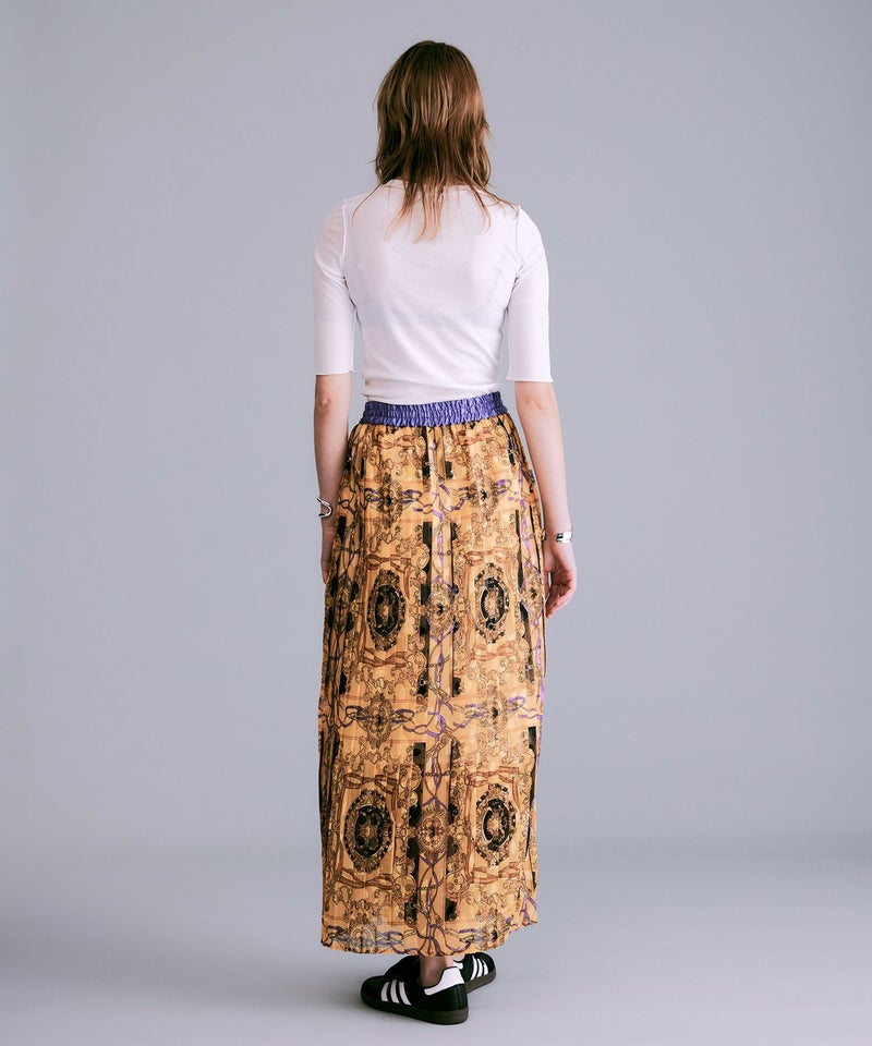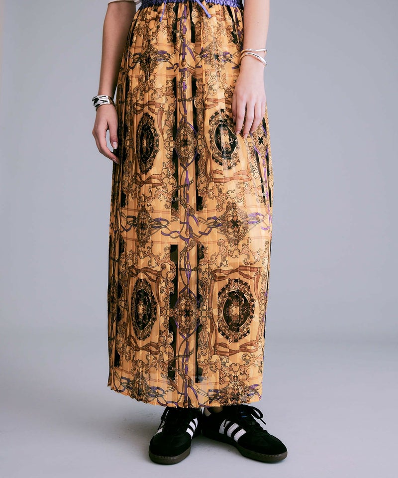 NOISEMAKERらしい印象的なスカーフ柄のプリーツロングスカート。