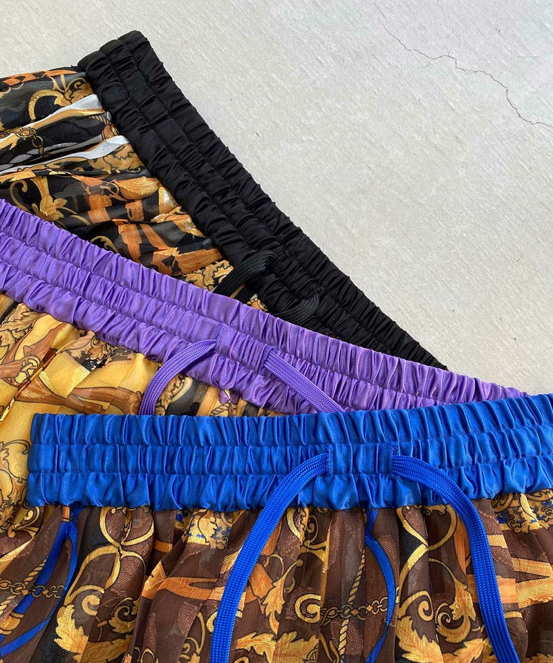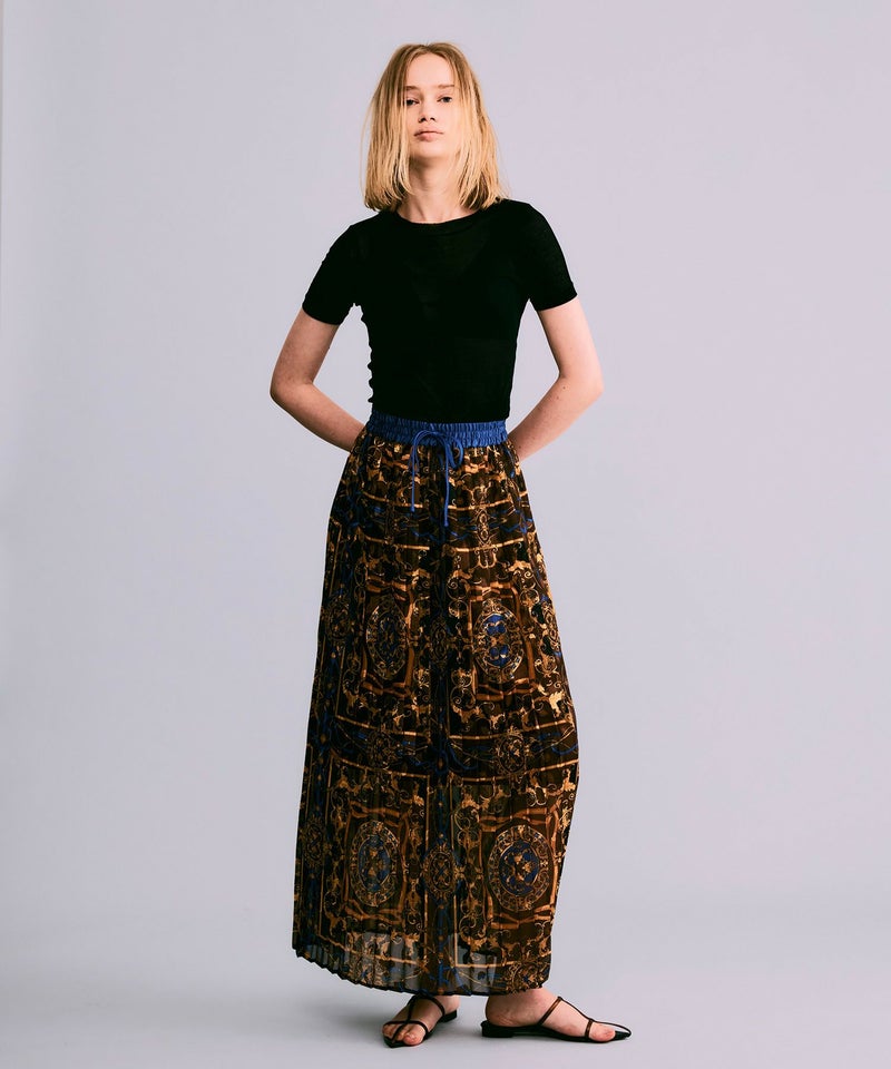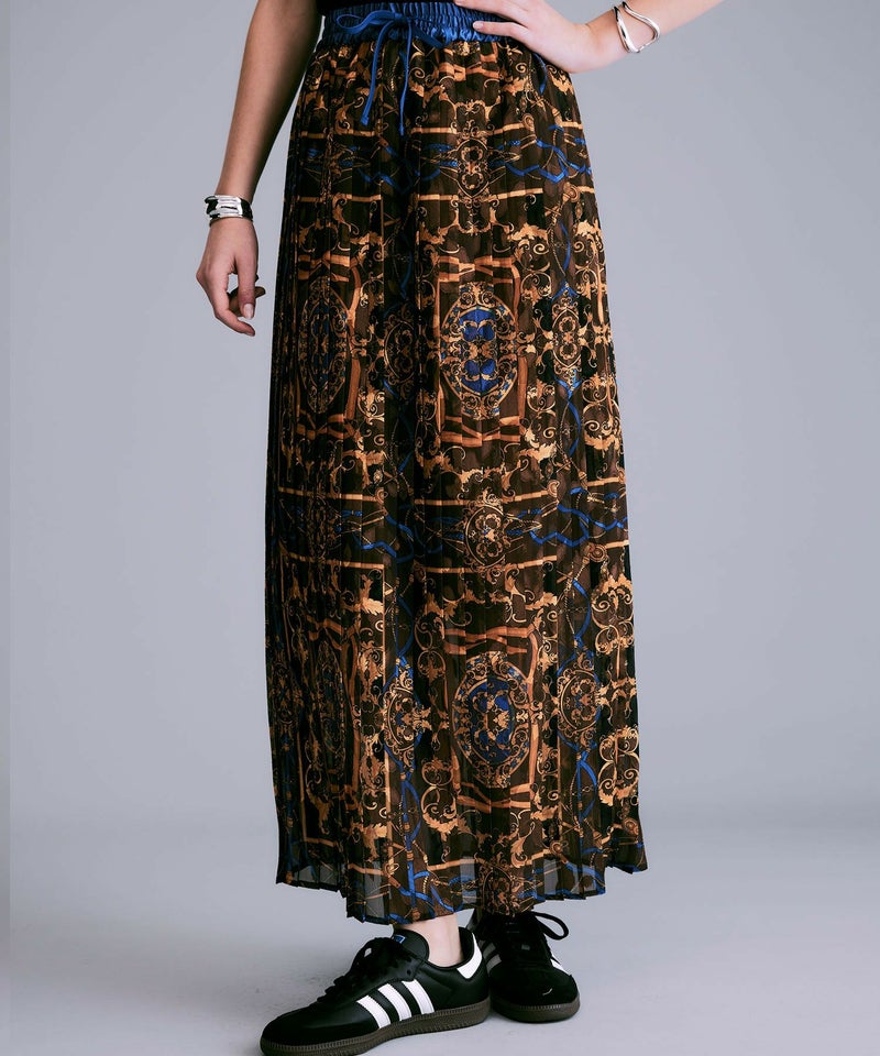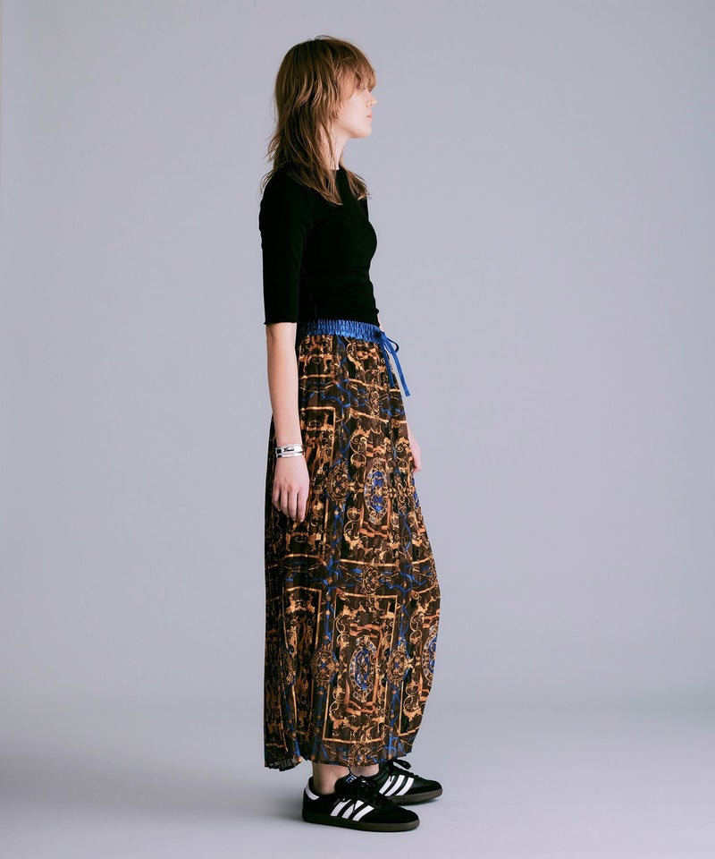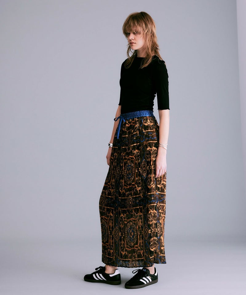 NOISEMAKERらしい印象的なスカーフ柄のプリーツロングスカート。