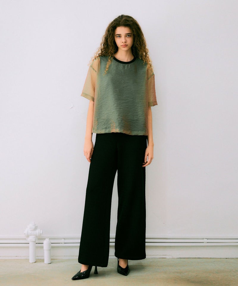 カットソーにシアー感のあるシャンブルオーガンジーをドッキングさせたデザインが魅力のデザインTシャツ。